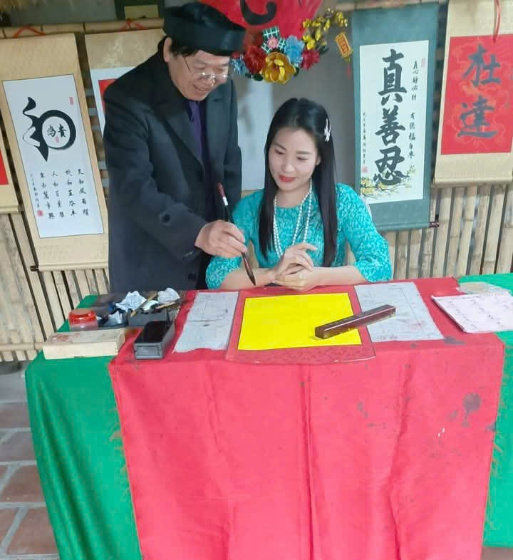 Thầy giáo Nguyễn Đình Triển hướng dẫn học viên viết Thư pháp.