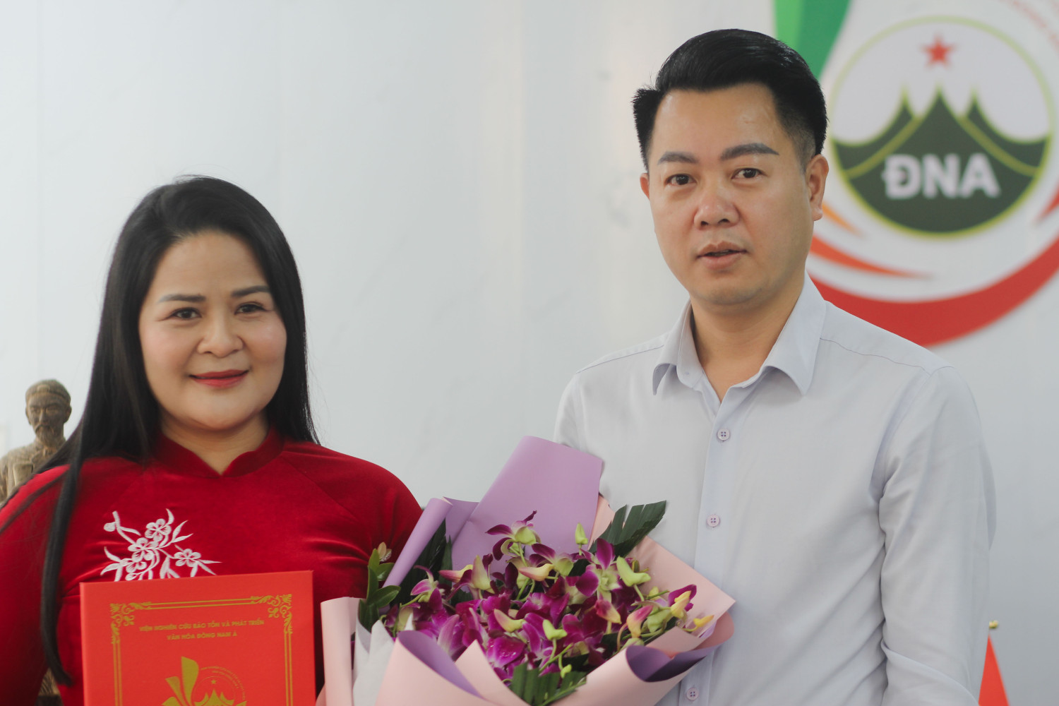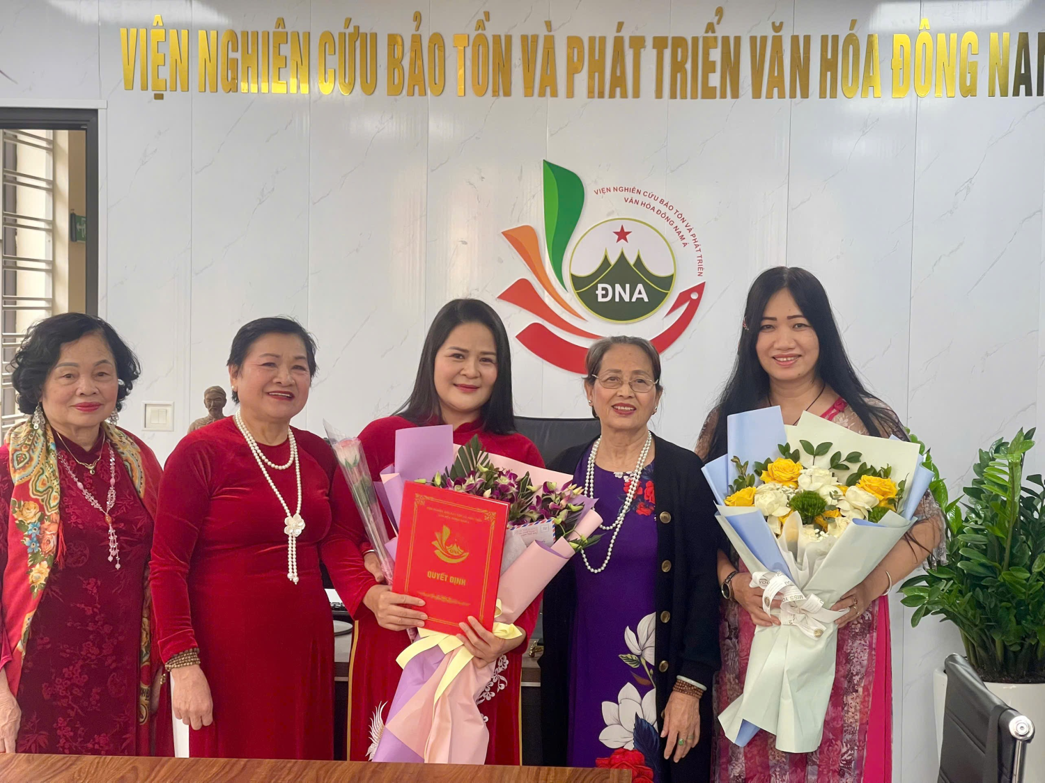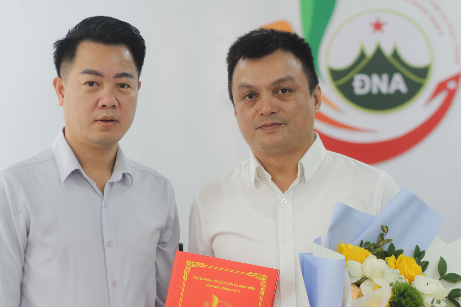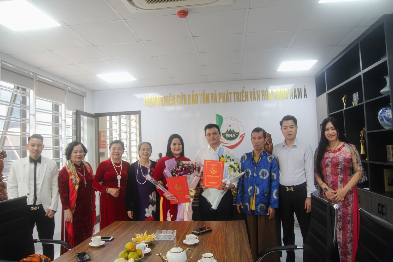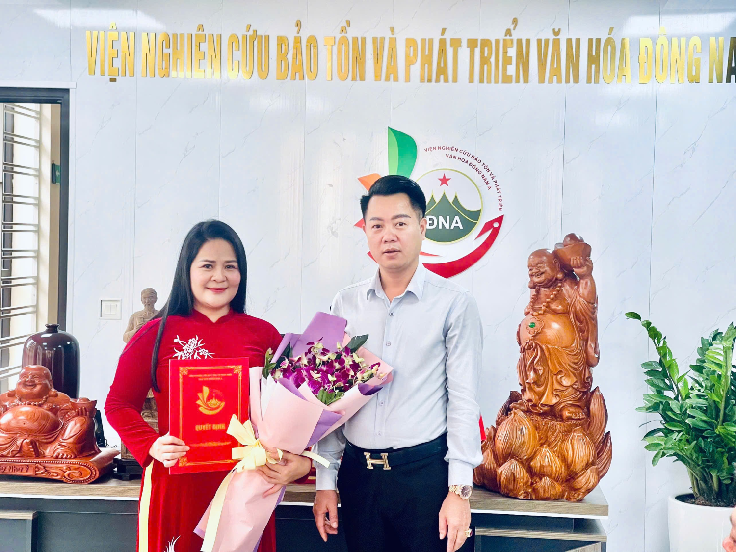 Phạm Văn Thăng - Viện trưởng Viện Nghiên cứu Bảo tồn và Phát triển Văn hóa Đông Nam Á trao quyết định và tặng hoa chúc mừng hai tân cán bộ